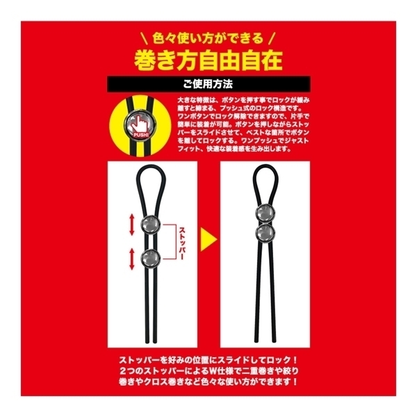 押すと緩み、離すと締まる押しボタン式ロックが特徴♪ワンプッシュで簡単にサイズ調整ができ、しっかり固定!ストッパー付きで二重巻きなども可能です♪高伸縮で肌触りの良いシリコン素材を採用し、快適な使用感を実現!高伸縮でさわり心地の良いシリコン素材を採用。