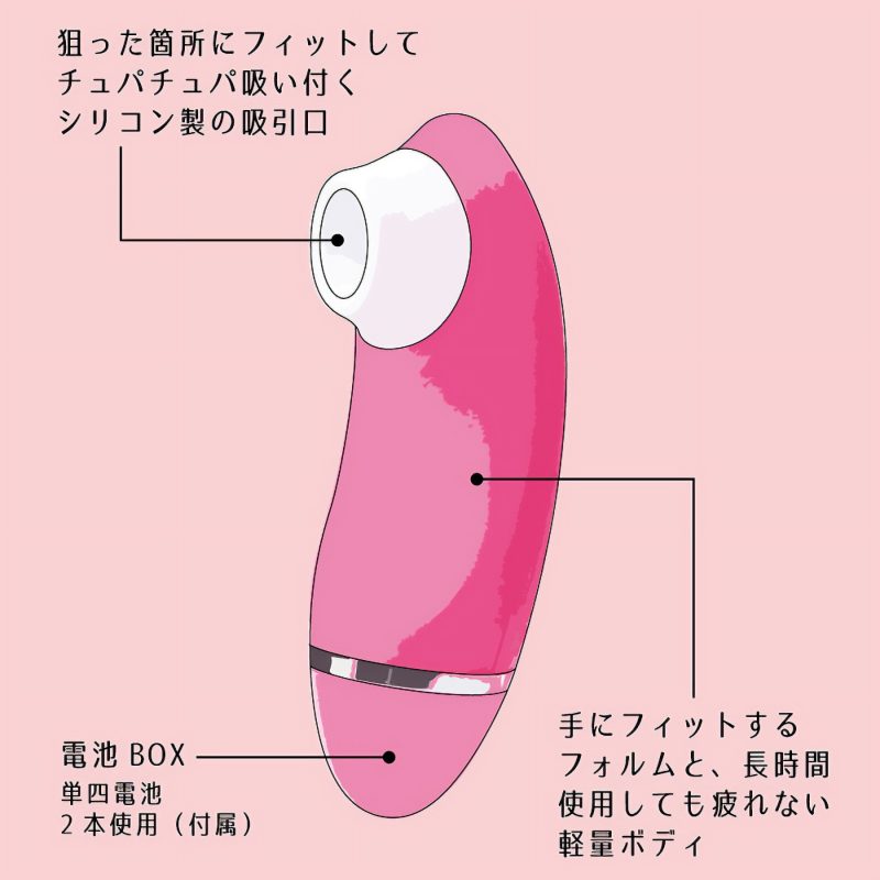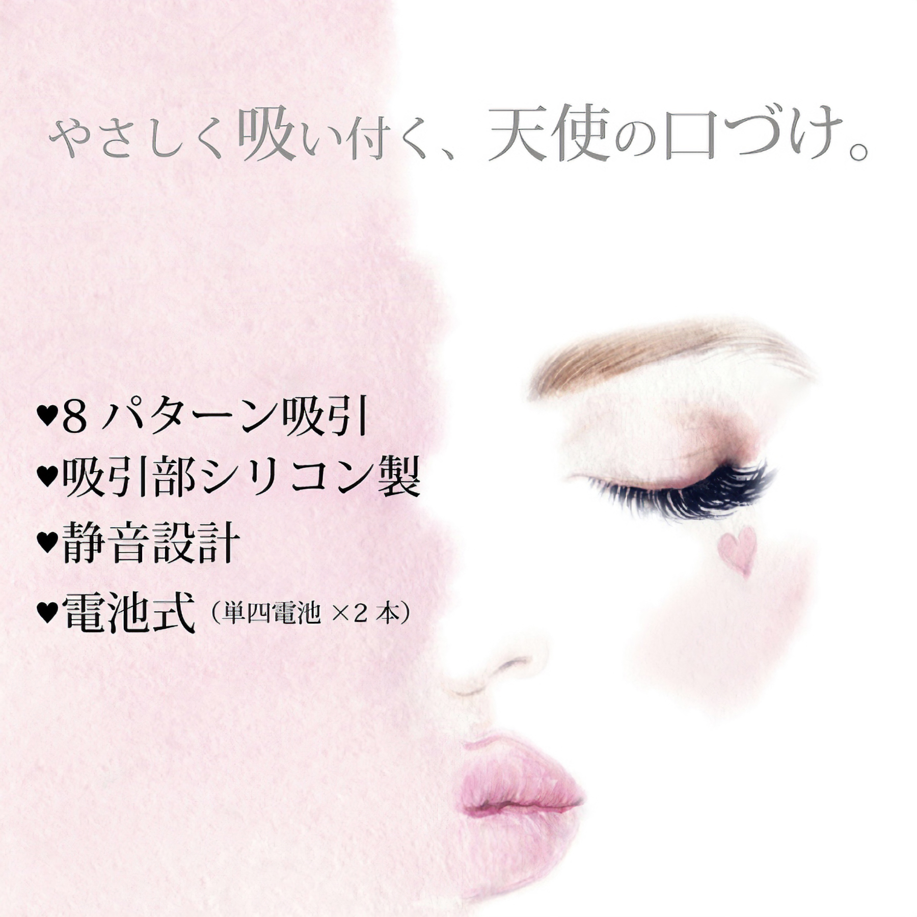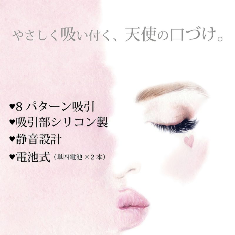 「優しく吸い付く、天使の口づけ」柔らかなシリコンがピンポイントに刺激する電池式の吸引ローター。手にフィットしやすい滑らかな曲線形状と、ロングプレイでも疲れにくい軽量ボディ設計!8種類の豊富な吸引パターンと、天使のようにふんわり優しい質感の吸引口が貴女を極上の世界へと誘います。単4電池を2本使用