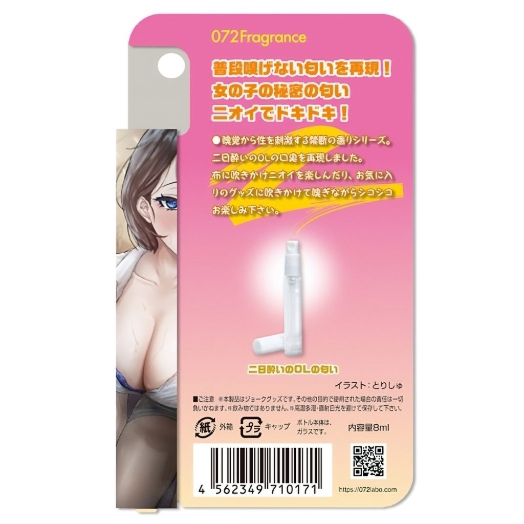 嗅覚から性を刺激する禁断の香りシリーズから「新人の女の子の二日酔いの朝イチの口臭」がするエッチなニオイのフレグランスが登場しました♪二日酔いOLの口臭の匂いを再現!布に吹きかけて脇の匂いを楽しんだり、お気に入りのグッズに吹きかけて嗅ぎながらシコシコお楽しみ下さい。