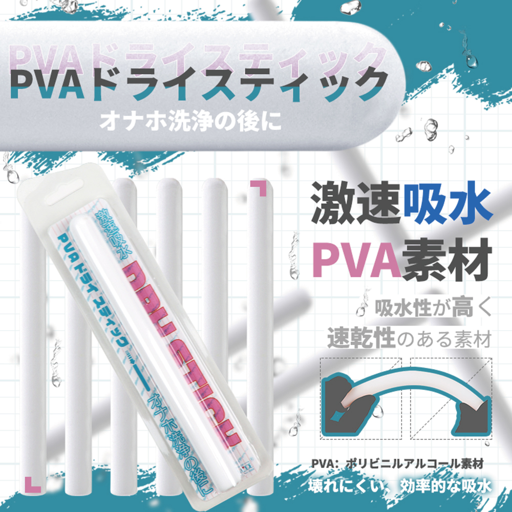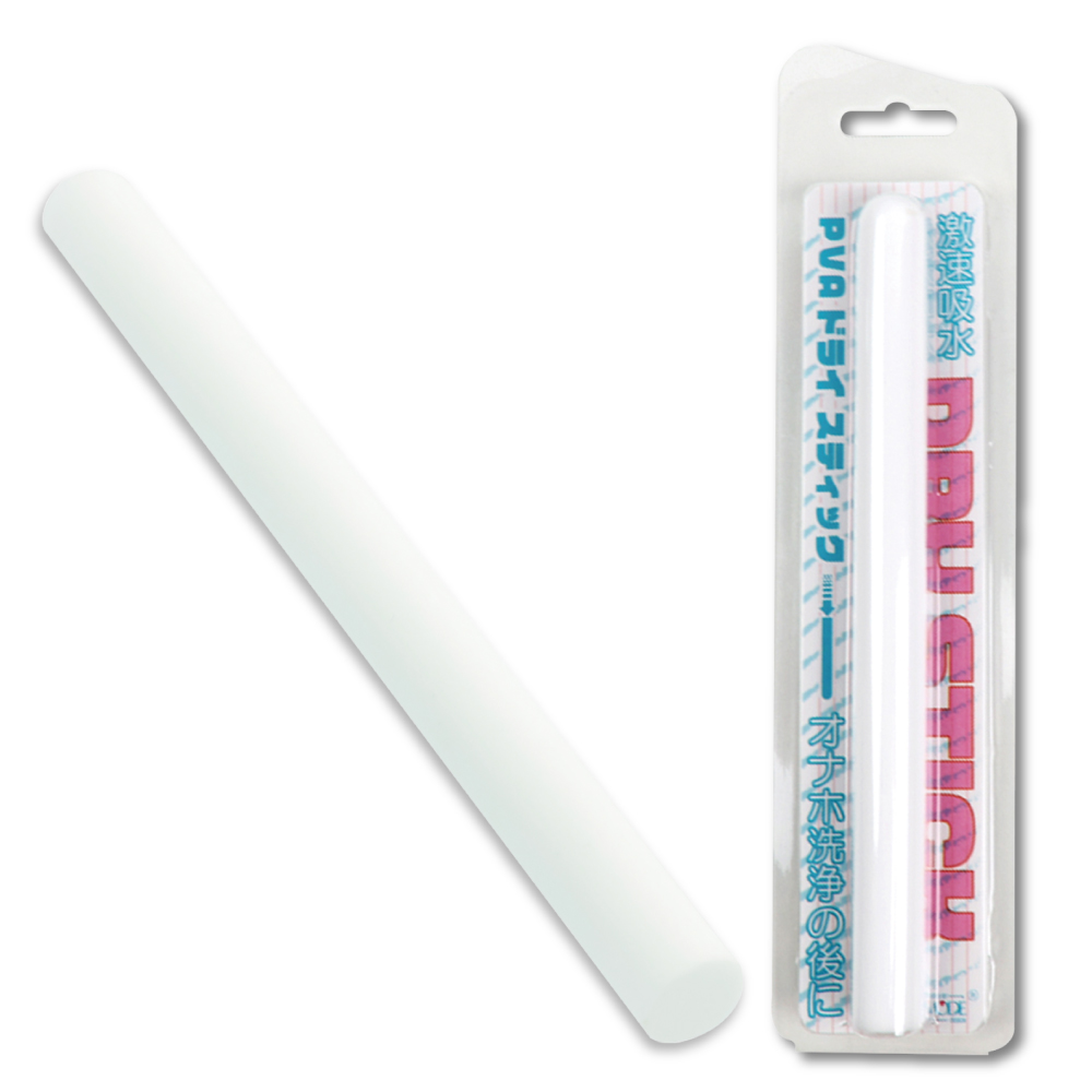 吸水性が高く、速乾性のある「PVA(ポリビニルアルコール)」素材採用<使い方>洗浄して水を切ったオナホの穴にスティックをそっと差し込みます。奥まで差し込んだらスティックへ水を吸着させるようにオナホをやさしく揉んでください。