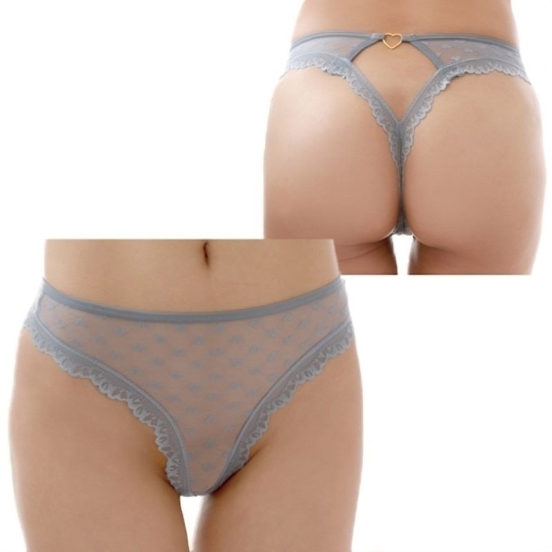 ラブリーなハート模様を控えめに魅せるデザインがポイント!グレー系のカラーメッシュ素材の透け見える感じで大人っぽさもあるTバックショーツ。ベースとなるメッシュ生地には小さなハート柄が入っていて、トリミングのレース使いや、深めのレッグカットが美脚なシルエットも演出してくれるショーツです♪フロントはやや大人しめなデザインですが、バックにはダイヤ型のカットアウトが入っており、トップにはゴールドのハートモチーフがアクセッぽくキラリと輝いて視線を惹きつけます!※刺繍などのデザインが異なる場合がございます。濡れたままの保管は色移りの原因になります。