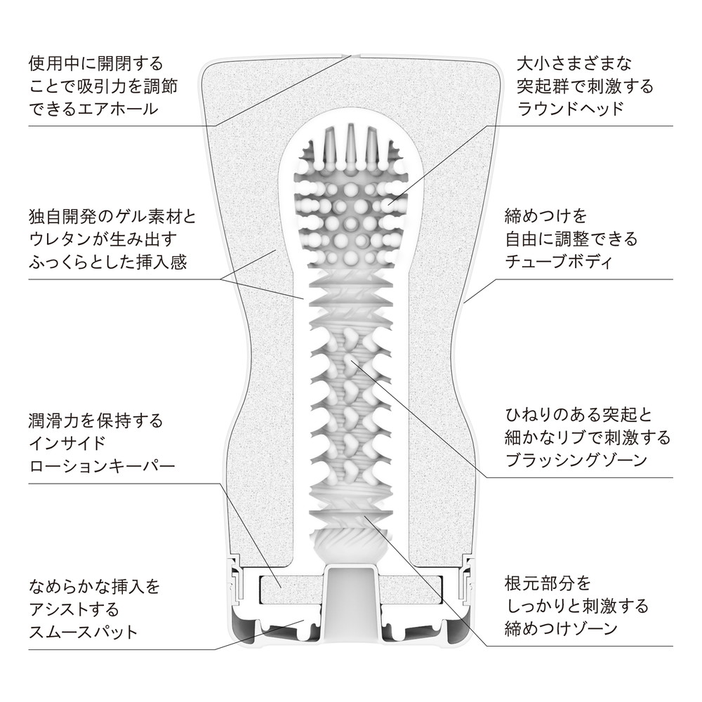 くびれが追加されたことでグリップ力UP!自由自在に締め付け感をコントロールできる「スクイズチューブカップ」。握って揉んで圧迫して…自分好みの力加減で締め付けることで多様な刺激をお楽しみいただけます♪使用中にエアホールを開閉すればバキューム力を調節することも◎