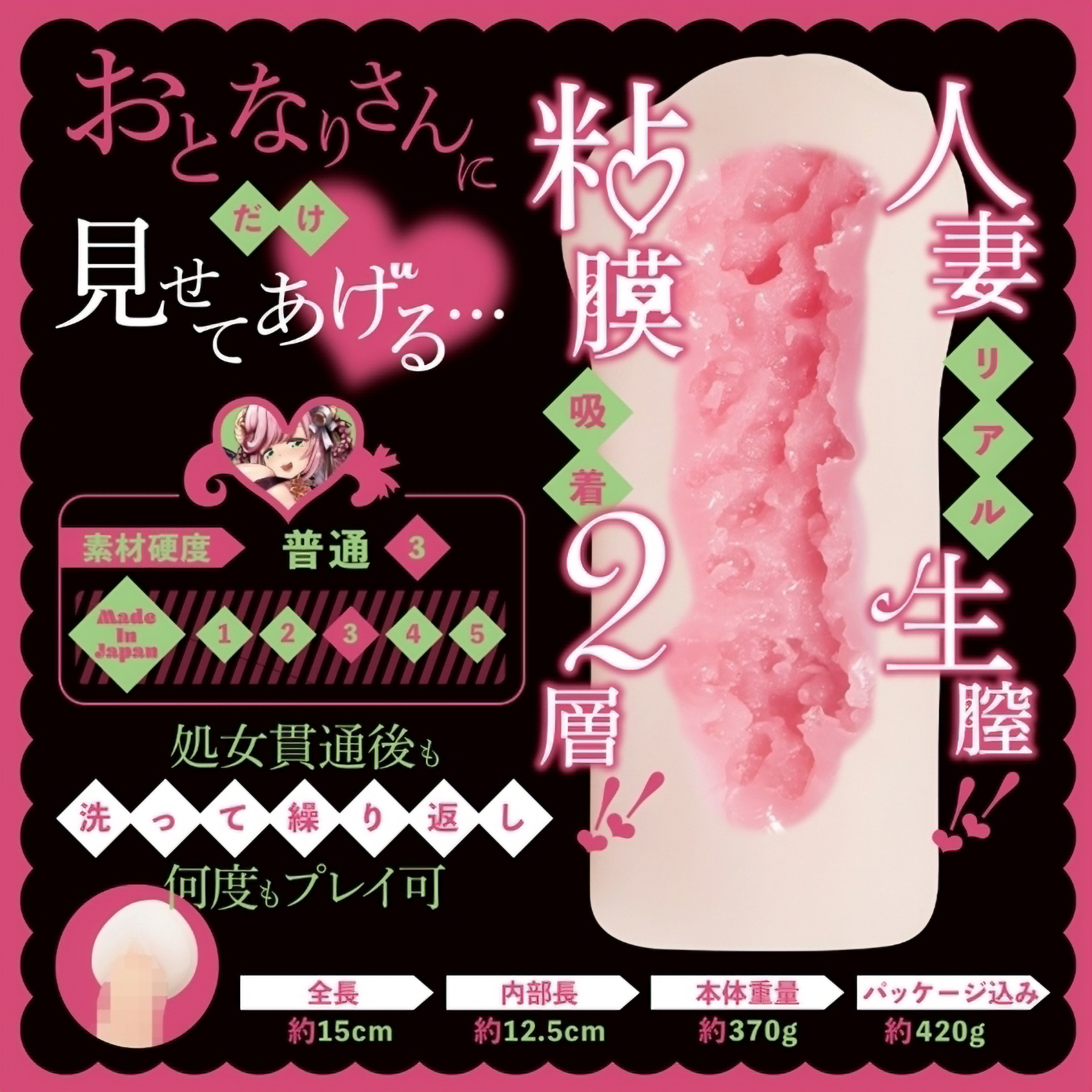 人気急上昇中の人妻Vtuber「夏芽みのり」が監修した、初の非貫通オナホ商品です。人妻でありながら処女という背徳感あふれる設定を忠実に再現し、驚きの処女膜ギミックを搭載!使用前には、優しく処女膜をいじり、膜が破ける瞬間をお楽しみください♪内部構造はリアルと妄想の絶妙なバランスで設計された2.5次元構造で、二層の粘膜感が驚くほどの生々しさを再現!非貫通タイプで、甘く優しいえっちタイムを存分にご堪能いただけます。